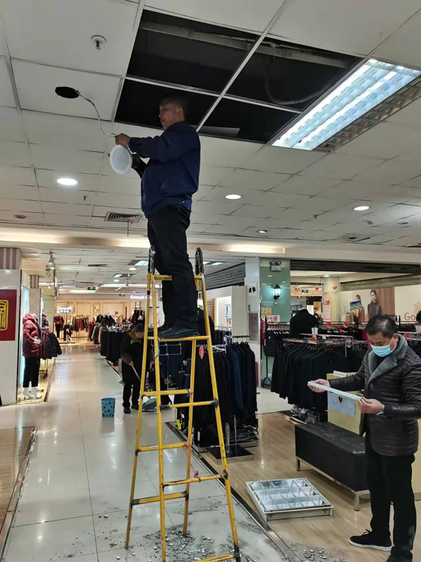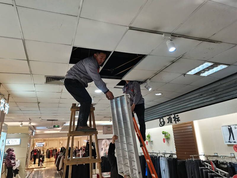 為了讓賣場照明設(shè)備既明亮又節(jié)能,后勤保障部電工班同志幾次跑市場找合適燈具,對多處頂部照明進(jìn)行更換。考慮到頂部天花板的承重等因素,還要對其進(jìn)行二次加固,所以更換一套格柵燈一個人需要在梯子上忙活近30分鐘,下來時腿腳已接近麻木。二樓扶手電梯頂部損壞的燈具更換起來很繁瑣,距離太高梯子高度夠不著,后勤保障部電工班摸索出了“小妙招”,自制工具輕松解決,而且不影響電梯的正常運轉(zhuǎn)。