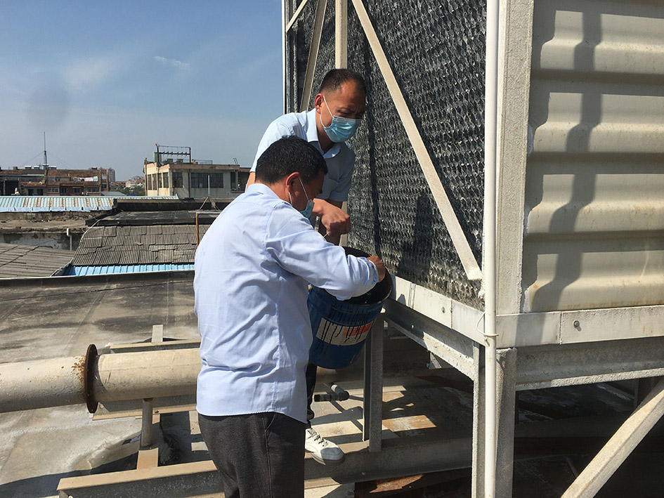 后勤保障部電工班組利用晴好天氣對(duì)空調(diào)冷卻塔進(jìn)行維護(hù)。