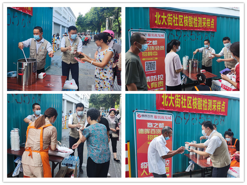 為關(guān)心堅(jiān)守防疫工作一線人員,弘揚(yáng)他們無(wú)私奉獻(xiàn)的精神,讓防疫人員“安心作戰(zhàn)”,為讓市民排隊(duì)等待檢測(cè)時(shí)更加舒適,8月21日星期天上午,巢湖商廈黨支部遠(yuǎn)航志愿者服務(wù)隊(duì)為北大街社區(qū)人民路核酸檢測(cè)點(diǎn)工作人員及市民送上“一片清涼”。為了讓大家喝到冰鎮(zhèn)的綠豆湯,商之都的工作人員早上三四點(diǎn)鐘開始熬制并放入冰箱進(jìn)行冰鎮(zhèn),小小綠豆湯,小小遮陽(yáng)扇,這一份份充滿愛的小“涼”方,讓現(xiàn)場(chǎng)的市民感動(dòng)不已。