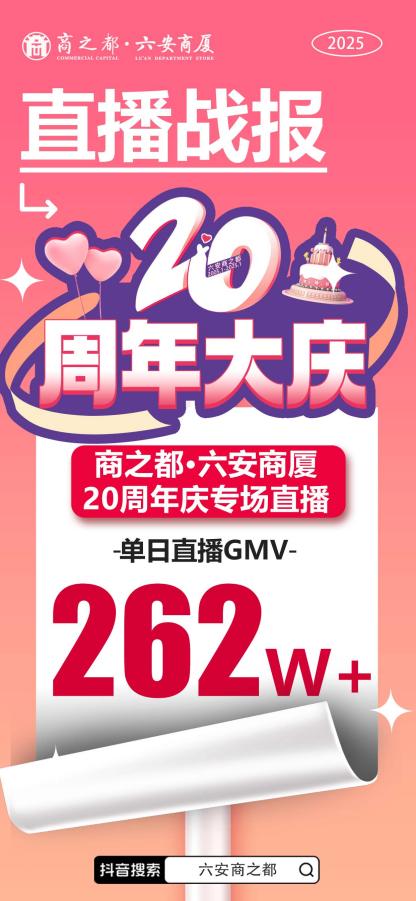 值得一提的是,2025年1月份,商之都六安店20周年店慶和紅府超市大吉大利鉅惠活動正在火熱進行中。1月16日,六安店20周年店慶抖音直播首秀單場銷售額超過260萬元,再次榮登抖音全國綜合商場排名榜第一。