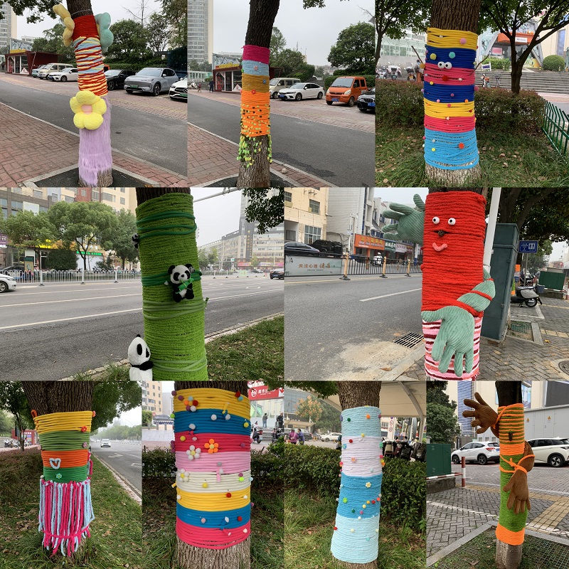 活動現(xiàn)場,小朋友、家長與黨員志愿者熱情高漲、默契配合。大家先完成色彩斑斕的毛線編織,再結合創(chuàng)意構思設計造型,最后細致地將編織品纏繞、固定在樹干上 。片刻之間,秋風中略顯蕭瑟的大樹,便披上了充滿童趣與創(chuàng)意的“毛衣”,成為街區(qū)一道兼具美觀與溫度的獨特風景線。