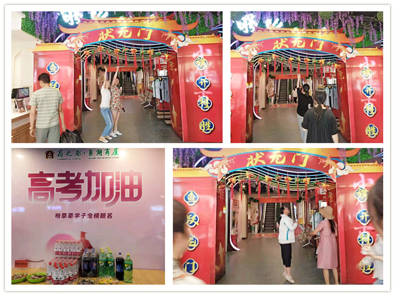 本次巢湖商廈繼續(xù)在商廈內(nèi)建立了高/中考服務站,為高考學生和家長提供飲用水、防暑藥等消暑用具?,F(xiàn)場搭建的狀元門吸引了不少考生們前來“沾喜氣”。