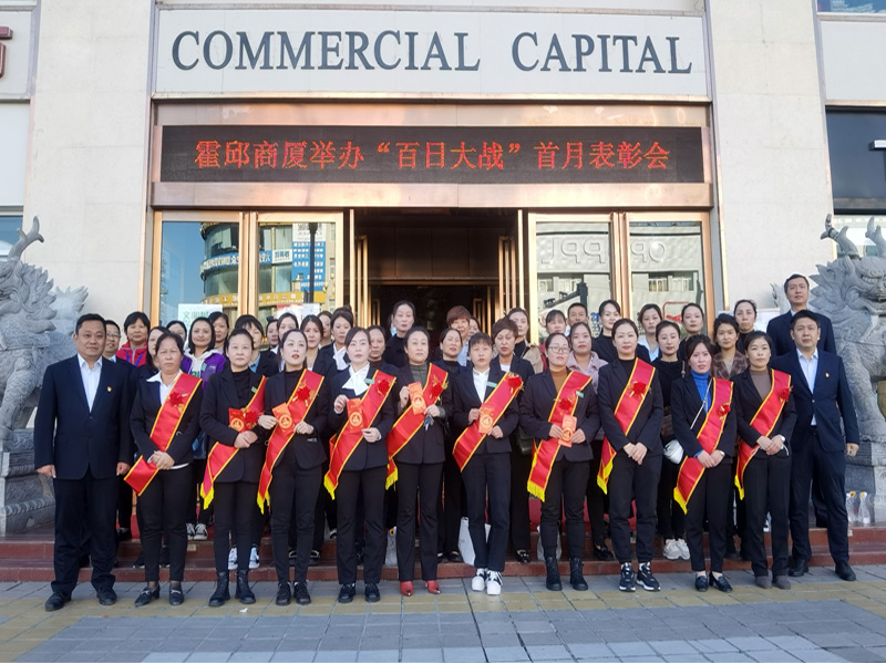 10月10日早進場前,霍邱商廈在門前廣場舉辦“百日大戰(zhàn)”首月表彰會,全體當班員工參會。