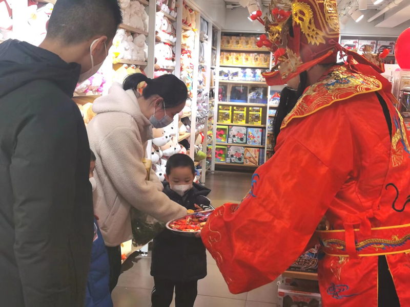 “福、?、壽、財(cái)”神由中心廣場(chǎng)員工扮演,戲服的扮相年味十足,“過大年”的氛圍瞬間拉滿。巡游中還增加了“金幣”“金元寶”糖果的發(fā)放環(huán)節(jié),一聲聲“新年快樂、財(cái)源廣進(jìn)”將大年初五的年味渲染的更加濃厚。顧客、商家和員工拿到寓意美好的糖果,收到濃濃的祝福,收獲了新年的驚喜和快樂。
