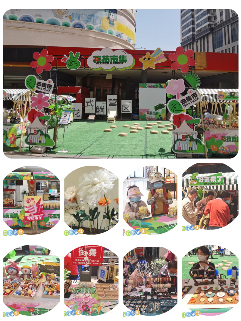 “花花市集”匯集茶飲果子、古風(fēng)扇子等文創(chuàng)小鋪約20余家,將傳統(tǒng)手工藝與現(xiàn)代創(chuàng)意設(shè)計相結(jié)合,款式新穎,抓住年輕人求奇的心理,在供顧客挑選的同時,增加了現(xiàn)場體驗制作環(huán)節(jié),大大提升了市集的趣味性。到了傍晚“花花市集”準(zhǔn)時播放經(jīng)典小劇場,大人小孩子三三兩兩,津津有味的看著小劇聊著天,微風(fēng)吹拂,好不愜意,實現(xiàn)了在家門口的露營最好狀態(tài)。店外場景與店內(nèi)“花花”網(wǎng)紅墻相呼應(yīng),店內(nèi)還可免費領(lǐng)取爆米花。
