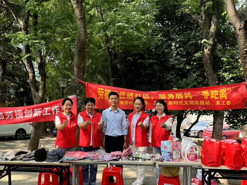 勞模創(chuàng)新工作室成員將紅府超市第九季洗護節(jié)-“國企國品、國貨國潮”立白洗護套裝拉到現(xiàn)場,搭配太陽傘、太陽帽等夏季防護用品為南園社區(qū)居民帶去優(yōu)質(zhì)低價的商品和熱情周到的服務。
