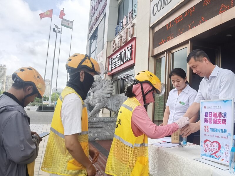 活動(dòng)現(xiàn)場(chǎng),商廈副總經(jīng)理、工會(huì)主席楊光與工會(huì)工作人員向環(huán)衛(wèi)工、外賣(mài)員、快遞員送上防暑降溫物品,提醒他們要注意防暑降溫。