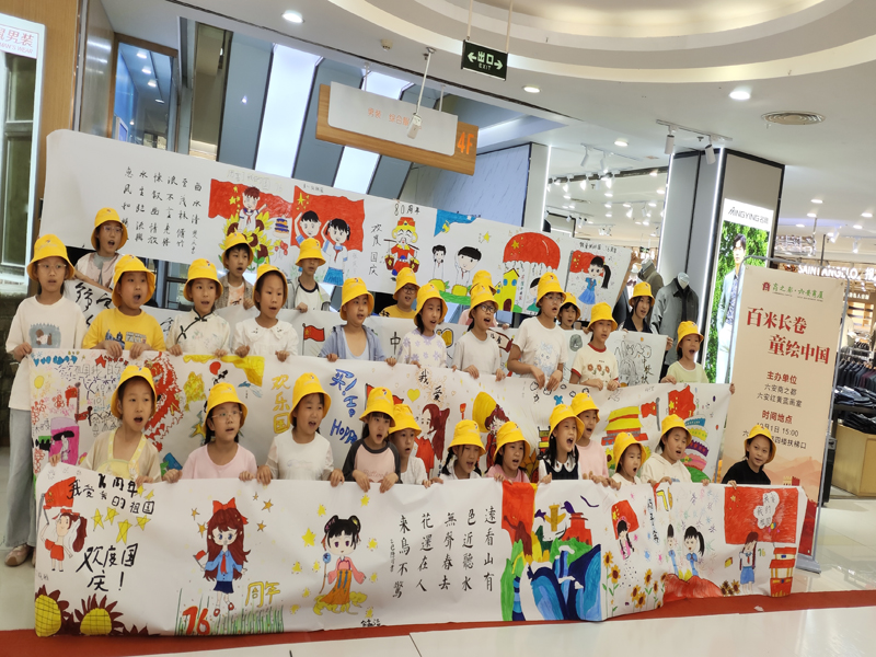 10月1日兩場活動吸引眾多市民參與,清晨,不少市民攜老帶幼匯聚商場廣場,共同見證升旗儀式,雄壯國歌聲中,五星紅旗緩緩升起,大家手持國旗肅立行注目禮,齊唱國歌,現(xiàn)場莊重而熱烈。當(dāng)日下午,商廈聯(lián)合紅黃藍(lán)書畫苑組織30名孩子開展“百米長卷 童繪中國”活動,孩子們以畫筆勾勒祖國壯麗山河,書法對祖國的熱愛與祝福。
