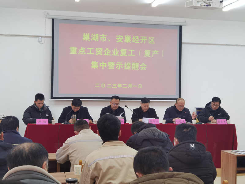 2月1日上午,巢湖商廈參加巢湖市、安巢經(jīng)開(kāi)區(qū)重點(diǎn)工貿(mào)企業(yè)復(fù)產(chǎn)復(fù)工集中警示提醒會(huì),合肥市應(yīng)急管理局工貿(mào)處處長(zhǎng)黃澤虎主持會(huì)議。