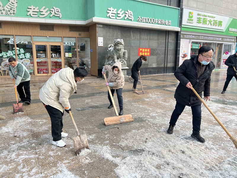 迎風(fēng)雪、戰(zhàn)嚴(yán)寒,經(jīng)過一個多小時的共同努力,購物中心門前廣場的積雪全部被清掃干凈,方便了市民群眾的購物與出行。